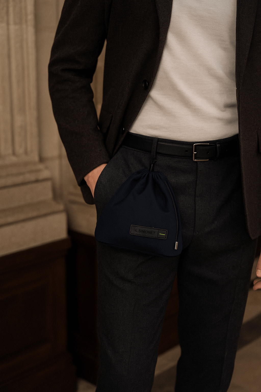 The pinnacle of J. Simonet design. Leather extends across top, bottom, back, borders, and drawstring. Complemented by titanium and leather snap hook and tips. Internal pockets ensure both luxury and function in its ultimate form.